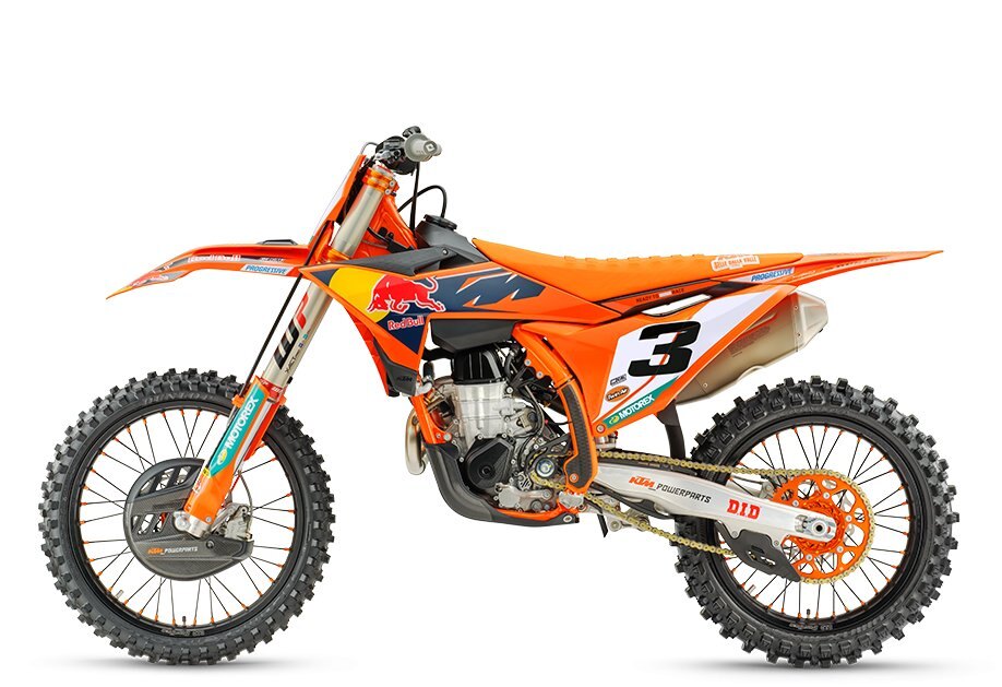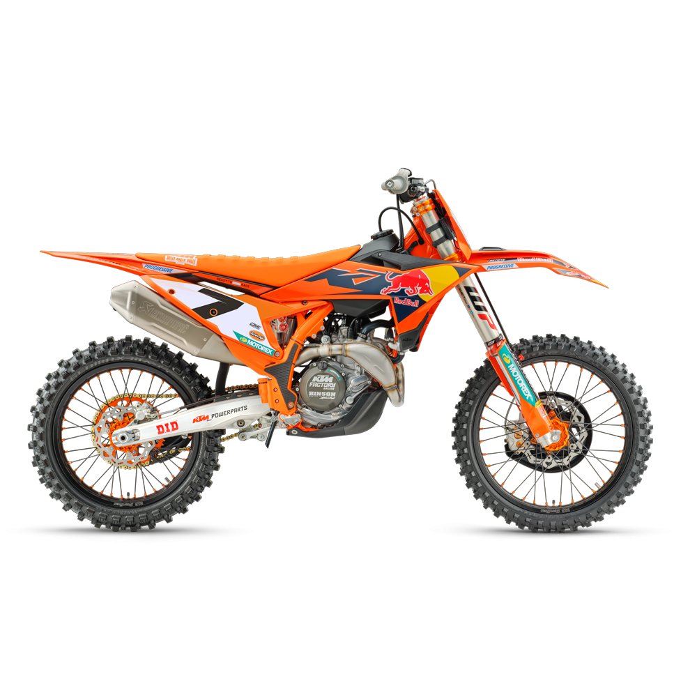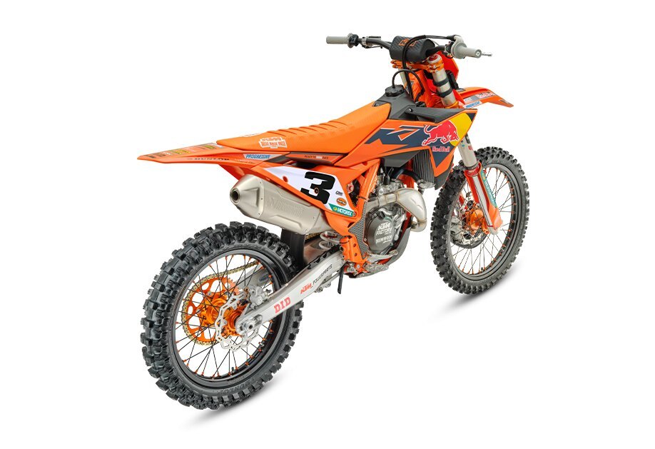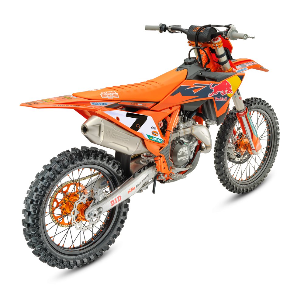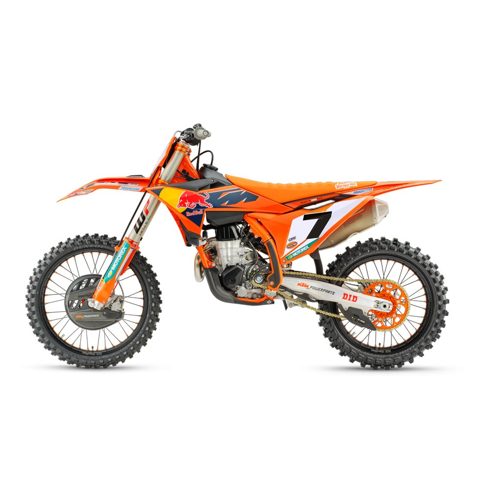 Marginal gains on the track are sought out through the strength of the details. The weight-saving, robustness and performance potential of components such as the Factory orange rear sprocket, Gold chain, D.I.D Factory wheel set and Dunlop GEOMAX tires -that promise performance and versatility - are other unmistakable elements of the 2026 KTM 450 SX-F FACTORY EDITION package |