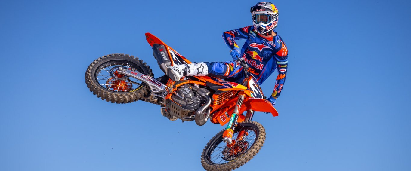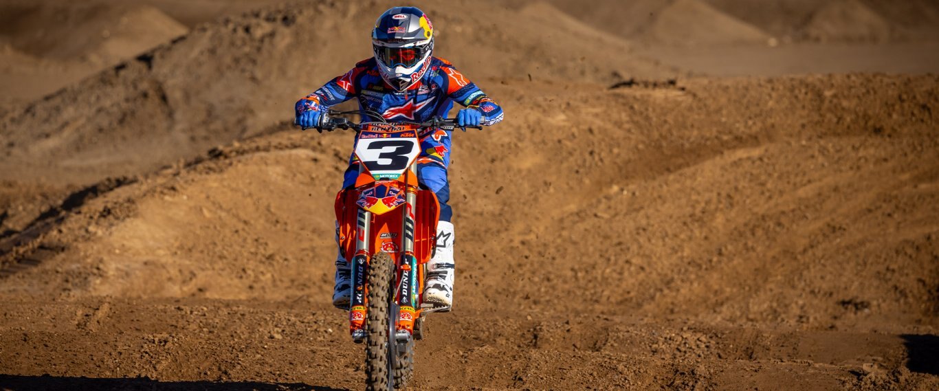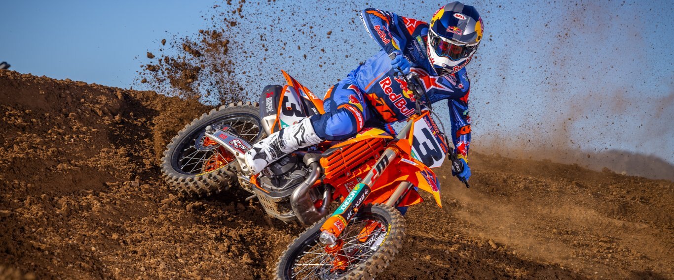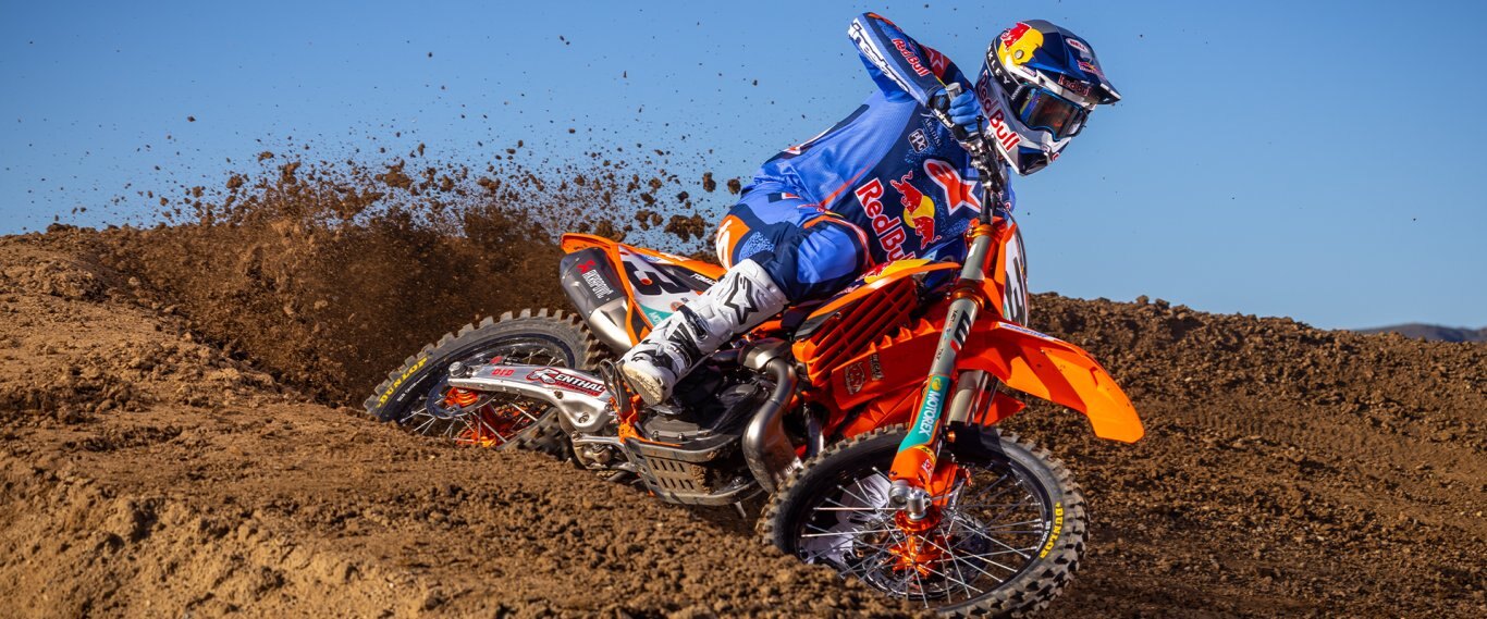 Getting power hooked into the dirt is a tough job. However, hours of research and testing have led the 2026 KTM Motocross range to the Dunlop GEOMAX MX34. Providing unmatched stability and control at the highest level, the rubber features a rigid carcass and rubber compound that improves damping and absorption, maintaining performance up to 30% longer than previous models. Progressive Cornering Block Technology also improves grip in the berms, while the rear pattern has a tall and wide center block for desirable traction and control everywhere else. Lastly, this unique block arrangement works to dispel mud buildup, ensuring traction in even the muddiest of track conditions. |
