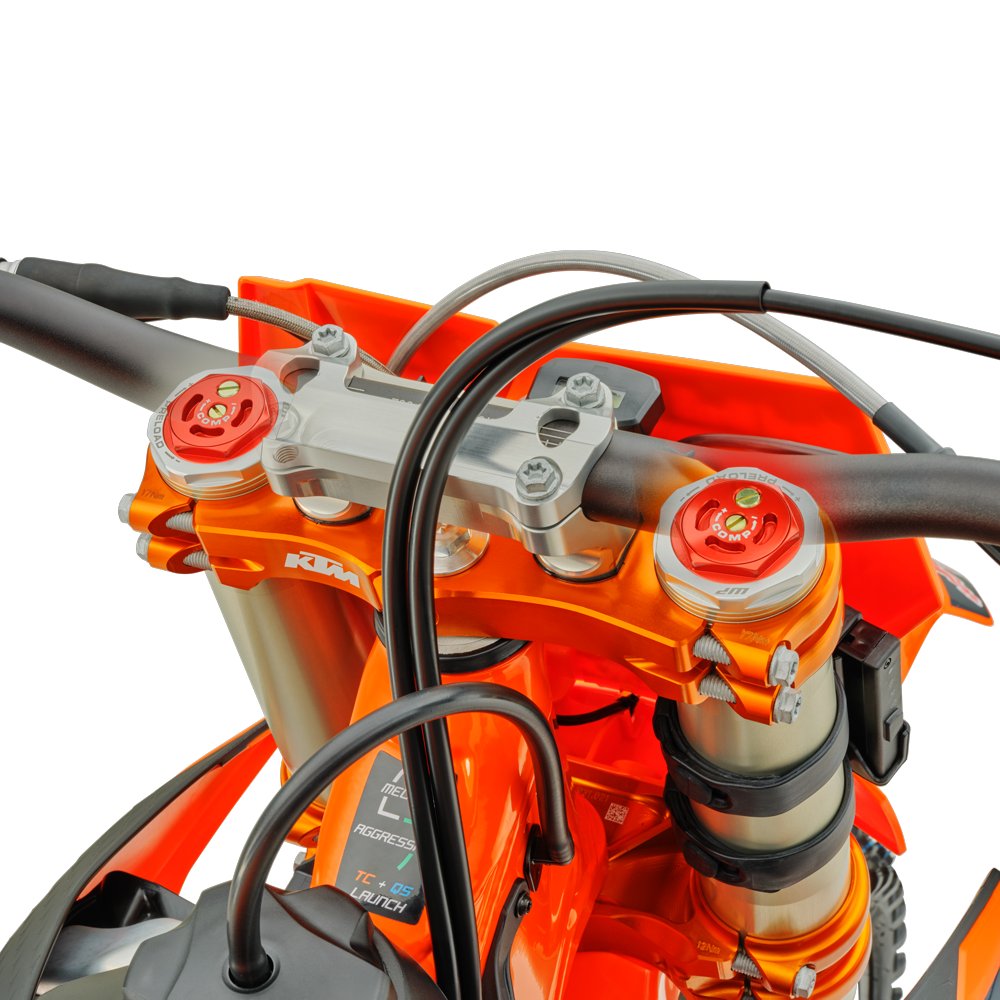 The 2026 KTM FACTORY EDITION range features a forged steering head connection and adjustable, orange-annodized, CNC-milled Factory triple clamps, making for the perfect alignment of the fork tubes. This precise geometry of the fork clamps ensures highly responsive and smooth fork action - not to mention unwavering stability when charging across ruts and onto the podium. |