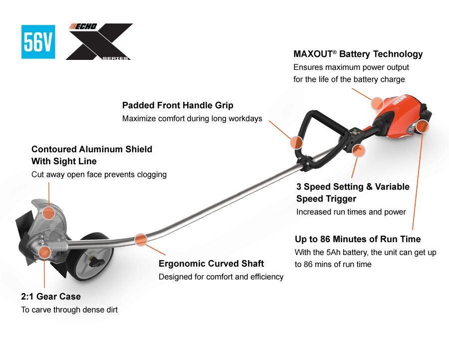 Designed for commercial landscapers, ECHO's DPE-2600 is a commercial-grade stick edger that, when used with an ECHO 5.0Ah battery, delivers an impressive runtime of up to 86 minutes